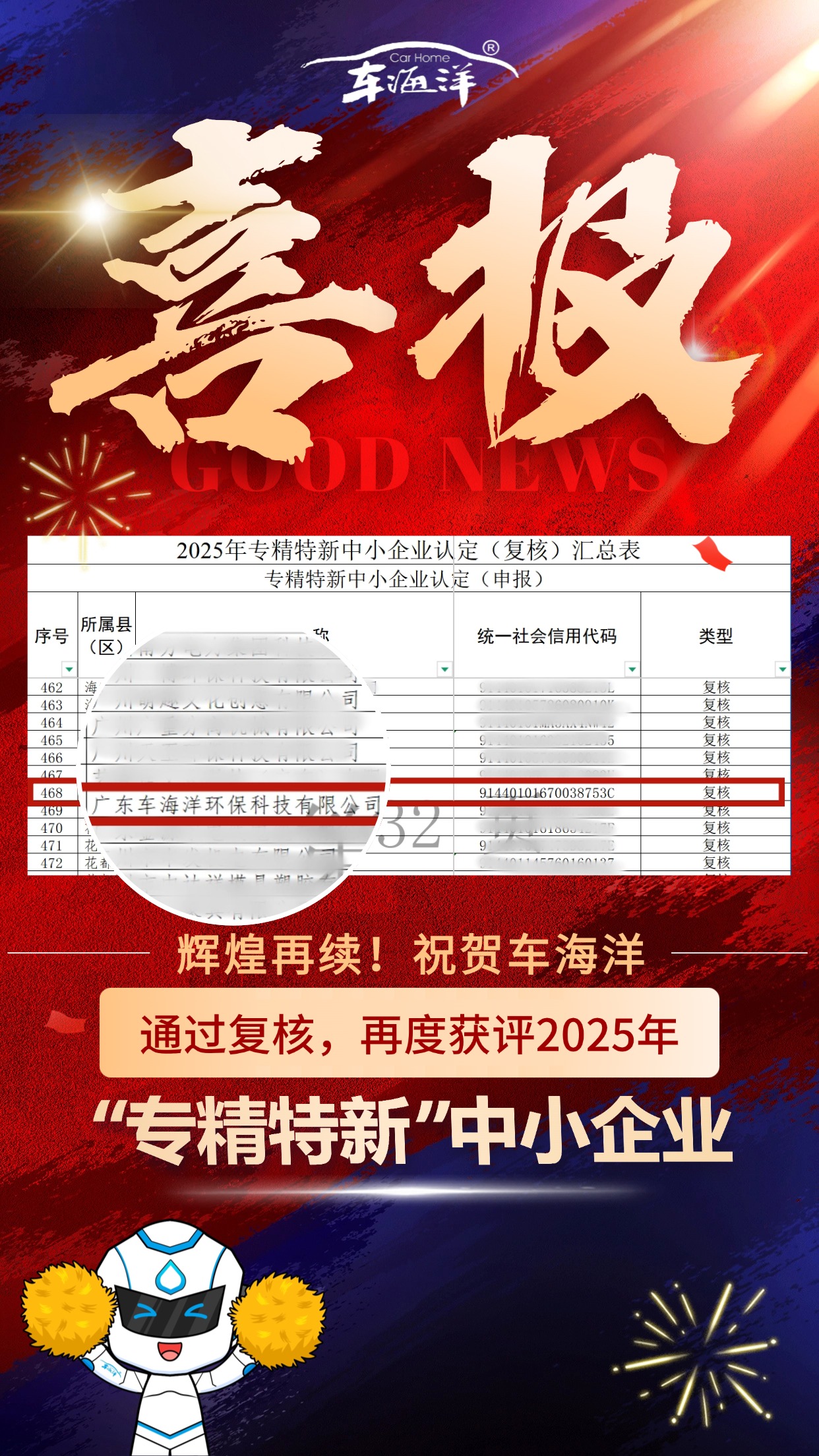 秋冬时节传捷报,砥砺深耕获殊荣!近日,经相关部门严格审查、专家评审及审核复核等系列严苛程序,广东车海洋环保科技有限公司(以下简称“车海洋”)成功通过复核,再度荣膺2025年“专精特新”中小企业称号。